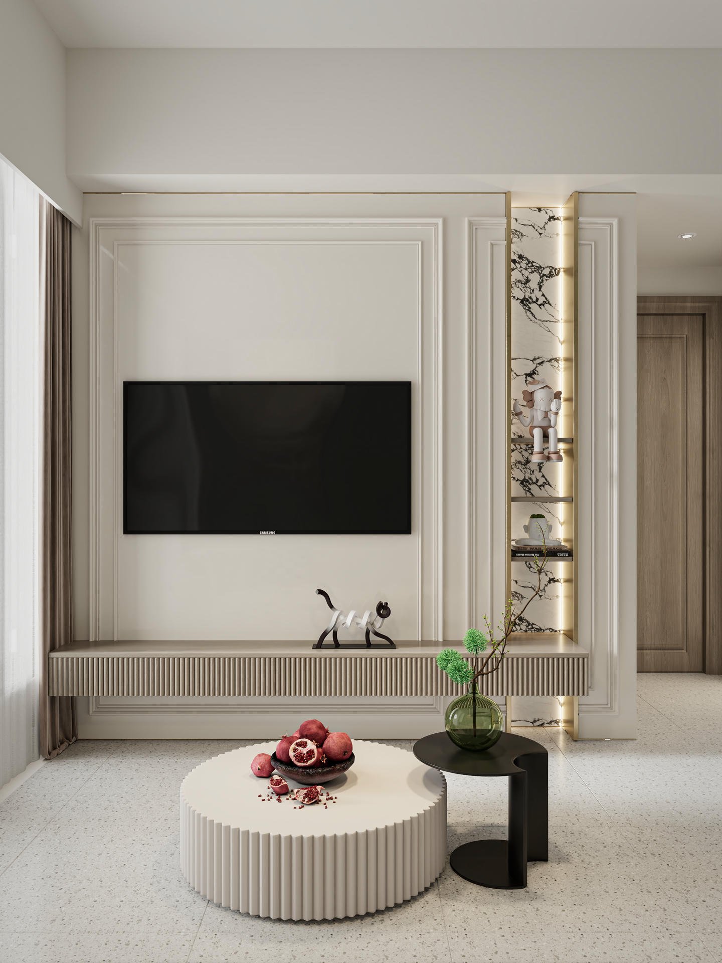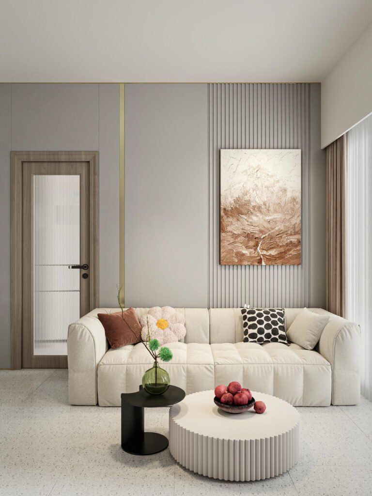 客廳以質感灰白為主色調,配合細膩的條子、精緻金屬、典雅花線與柔和的燈帶設計作裝飾,不僅營造出豐富的視覺層次感,同時亦有延伸視覺效果,讓整體空間感更顯開闊。