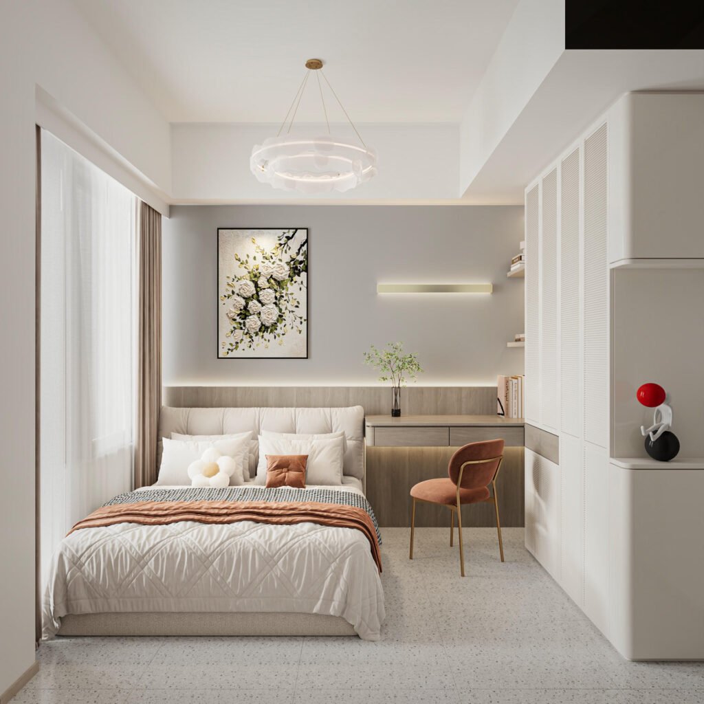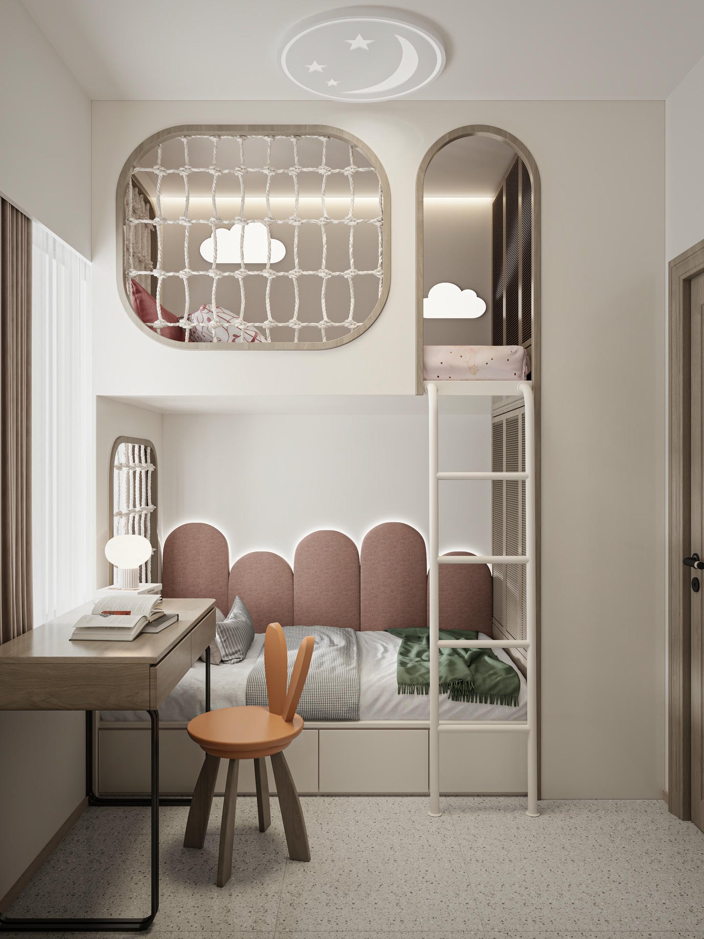 主人房的設計重點在於床背的特色牆。我們透過選用灰色藝術漆及溫潤的木板進行拼接,並只加設一道單一金屬層板,營造出充滿呼吸感的「留白美」。而兒童房設計則以小朋友最愛的繩網陣為概念,除了作為獨特的牆面裝飾外,亦可以用作小物掛件,美觀又實用。