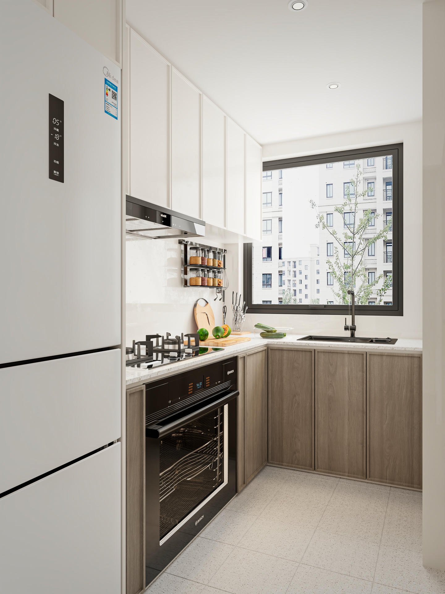 最後,廚房設計比較簡潔,重點是選用了耐磨、耐刮、耐髒又防水的水磨石枱面,讓屋主可以更放心煮食。這次的瑜一裝修項目,完美地將實用功能與極簡美學融為一體,創造出一個真正寧靜舒適的家。