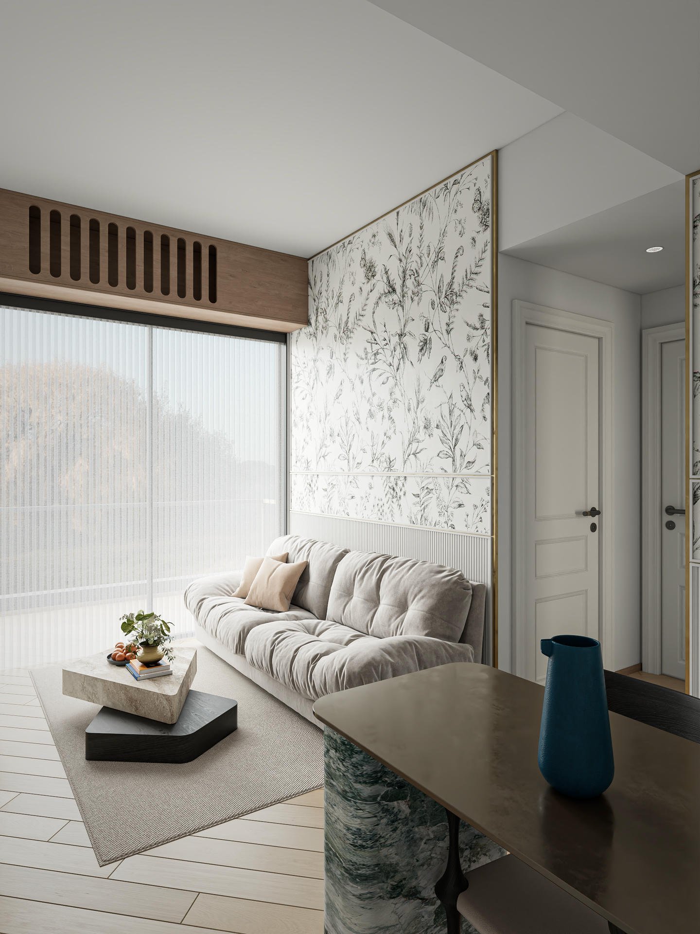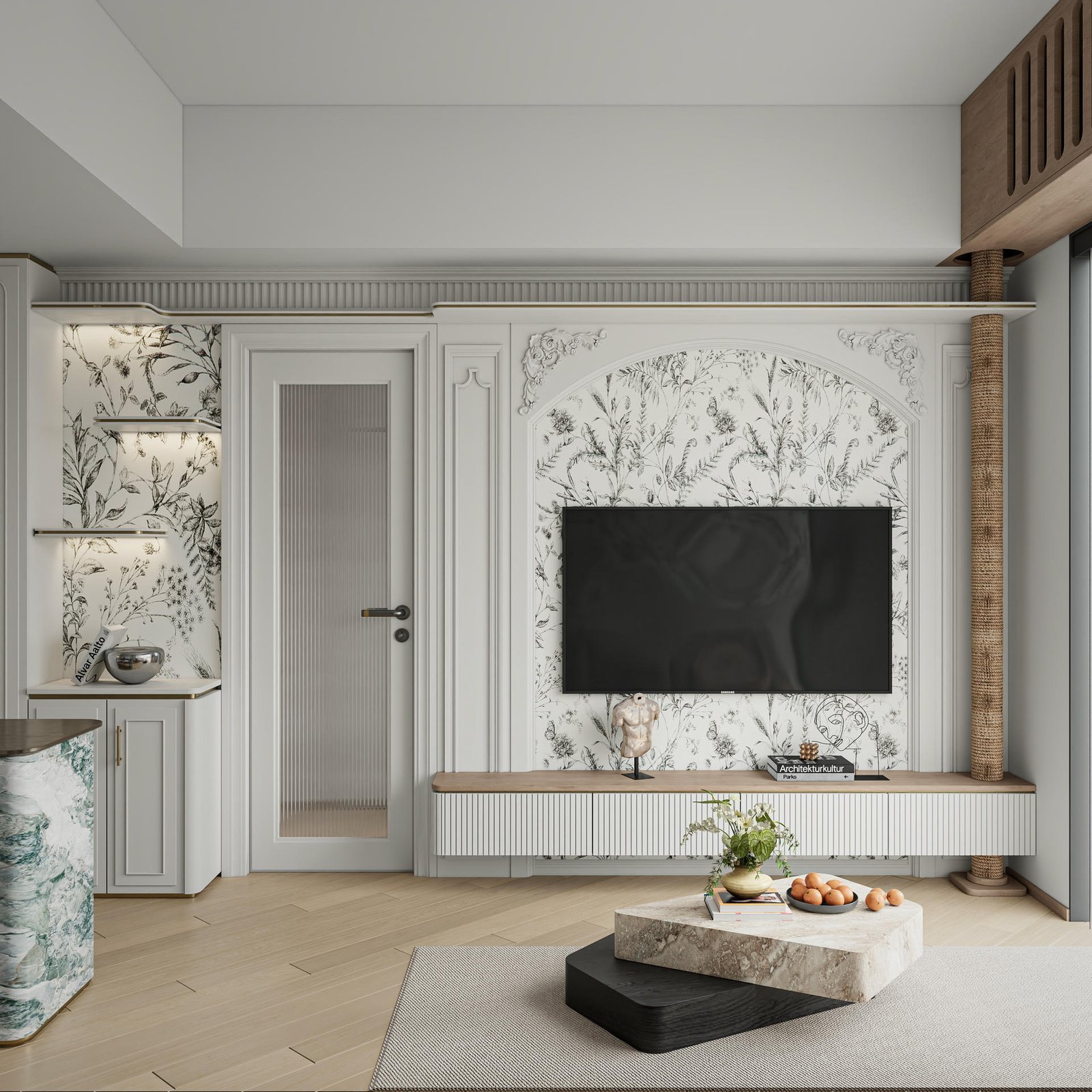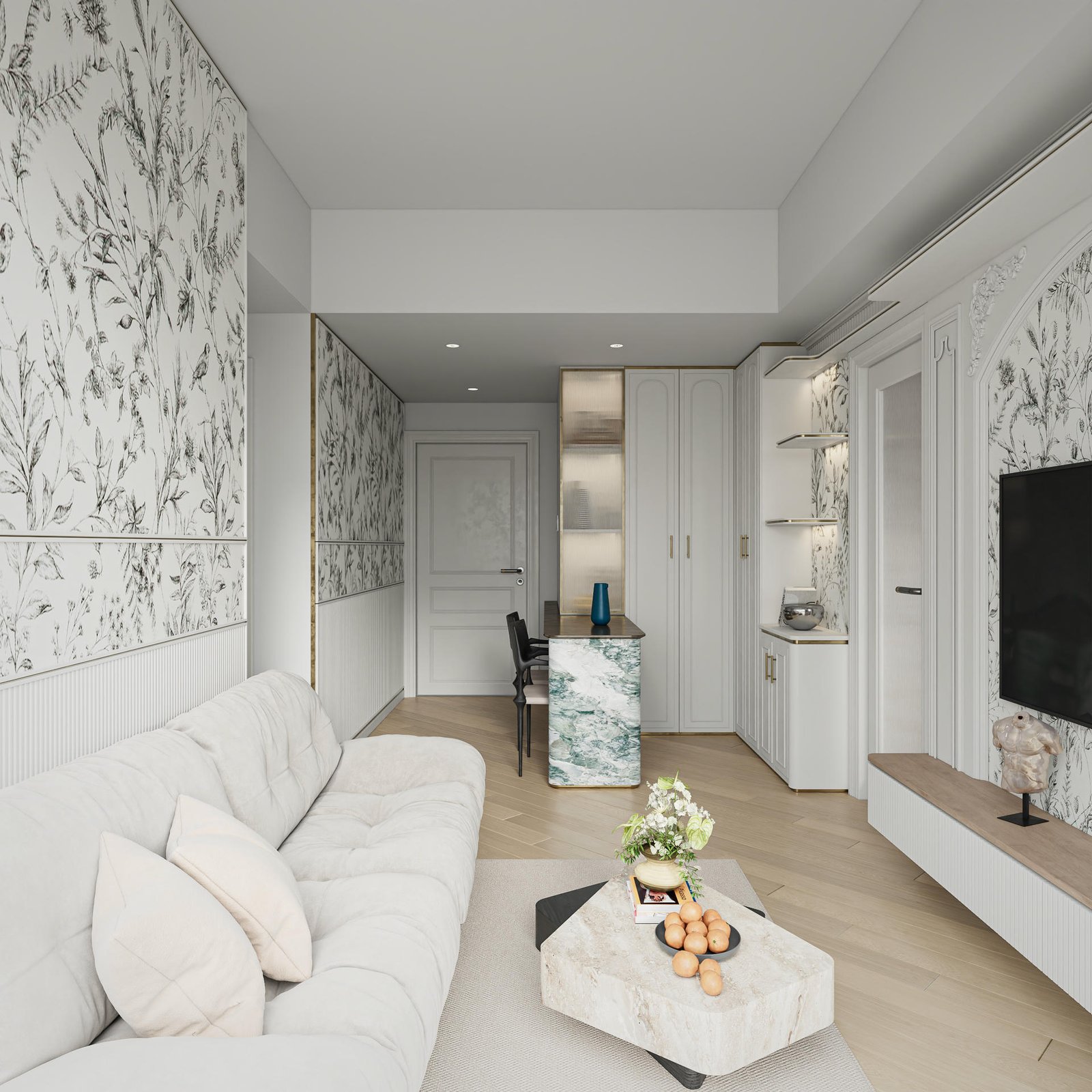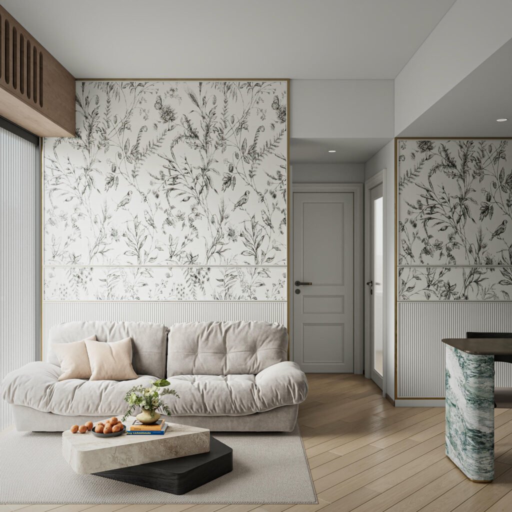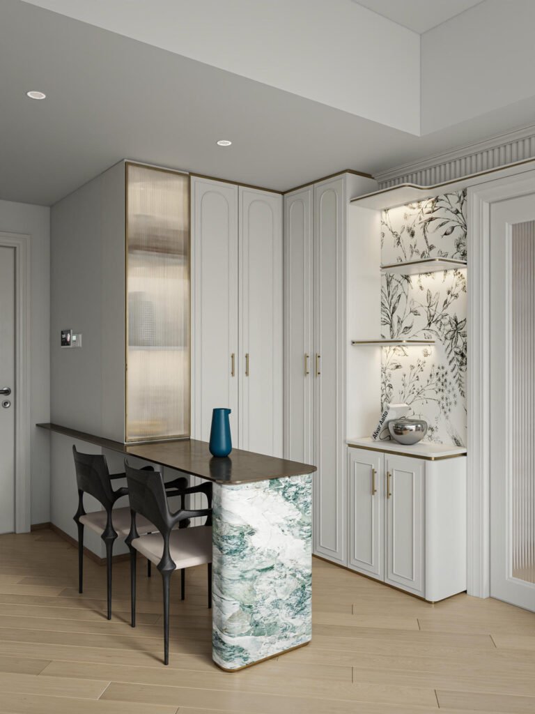 這次的 Koko Mare 室內設計,從一開始就圍繞著「人寵共居」的核心展開。我們精心挑選了對兒童與寵物皆友善的耐磨、無毒建材,確保家居環境的安全。設計的最大亮點,無疑是客廳的特色牆設計——它不僅是影音娛樂的背景,更巧妙地與一座貓跳台設計融為一體。透過精密的訂造傢俬工藝,電視櫃的層板延伸成貓咪的空中步道,讓主子的探索天性與家人的休閒時光和諧共存。牆身點綴著淡雅的花草藝術花紋與白綠色雲石紋,為空間注入一抹清新的田園氣息。