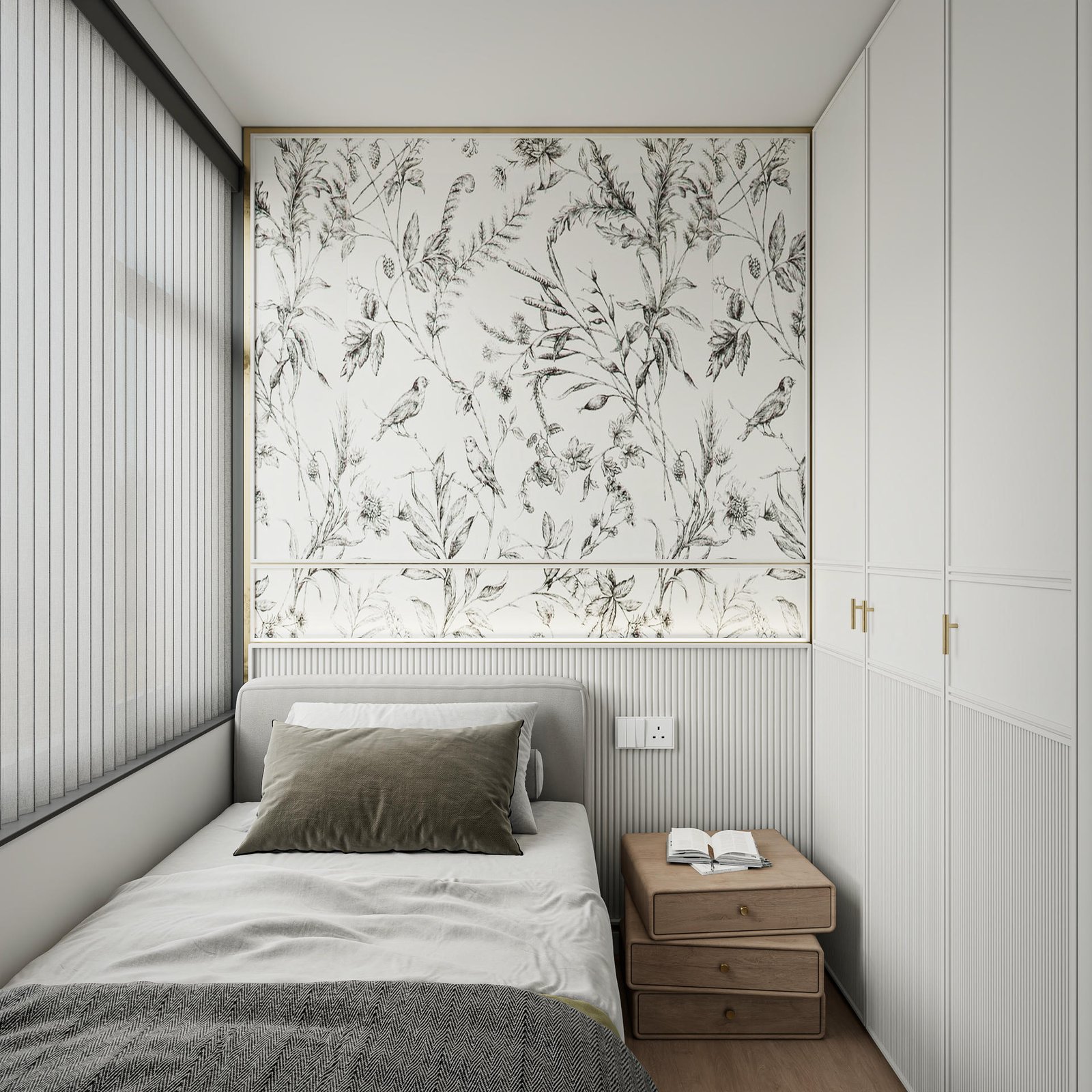 在兒童房設計上,我們延續了整體的設計語彙,以柔和的灰白色為主調,搭配簡潔的條子與花草圖案,營造出一個寧靜而富有想像力的成長空間,溫柔地呵護著孩子的童年。