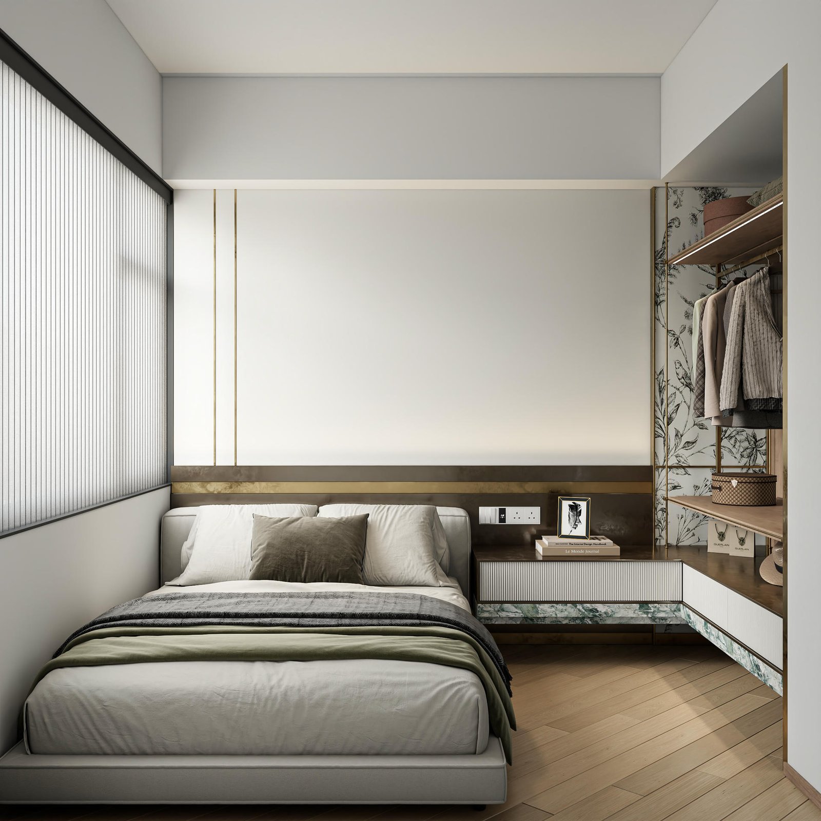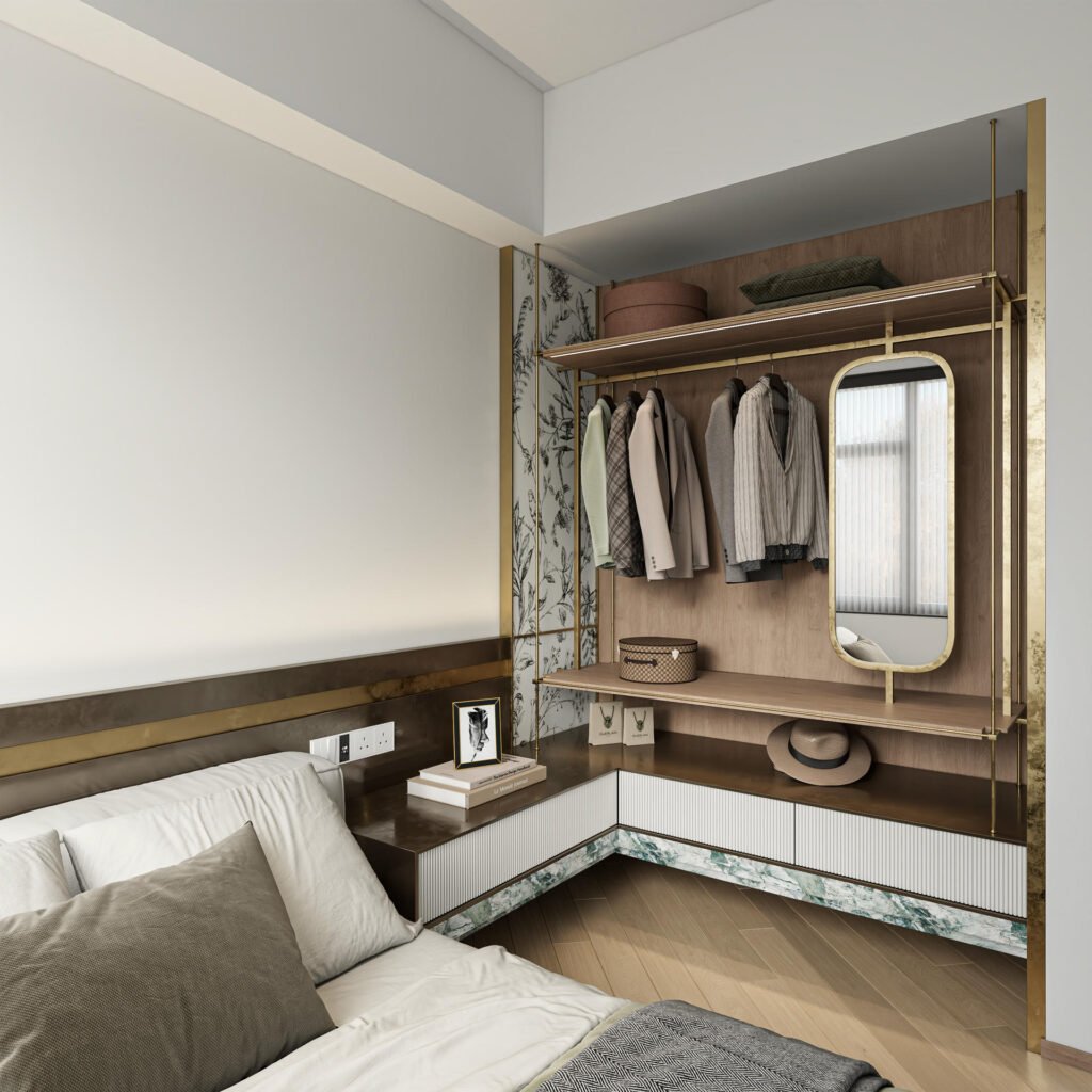 步入主人房,設計的巧思仍在延續。我們採用了開放式衣櫥,並將其與床頭櫃無縫連接,不僅提升了空間的開闊感,更創造出流暢的生活動線。衣櫥旁一面精緻的復古金屬邊半身鏡,為這個靜謐的休憩空間增添了幾分典雅的質感。