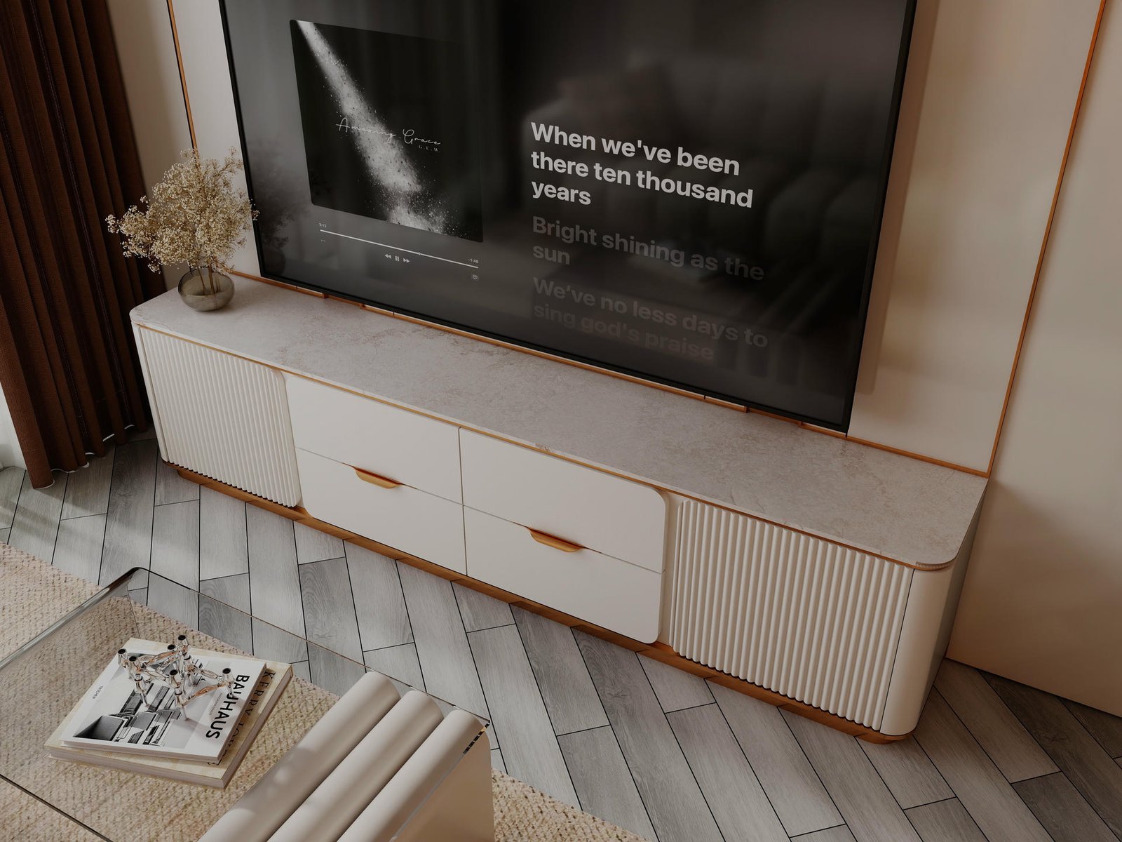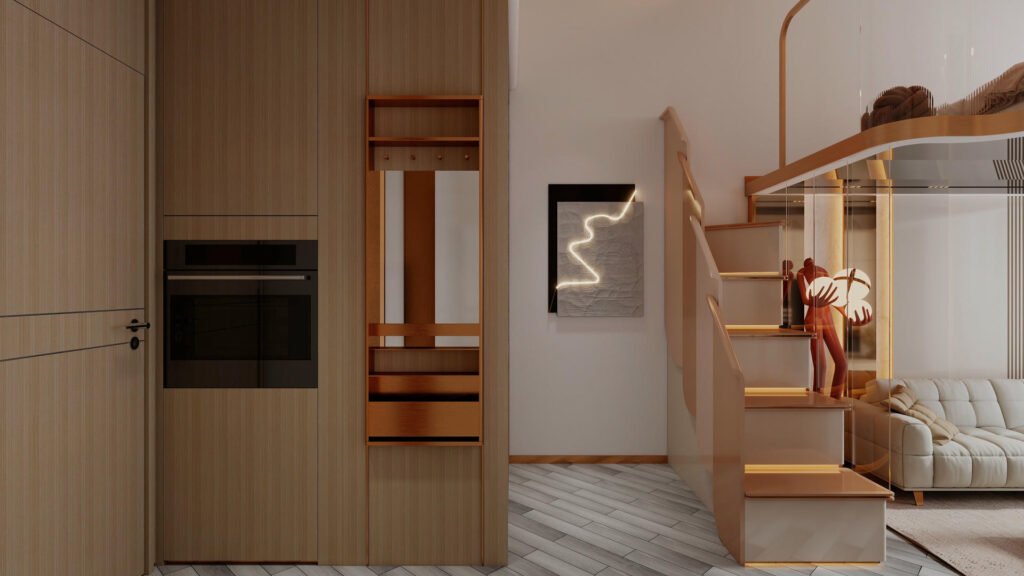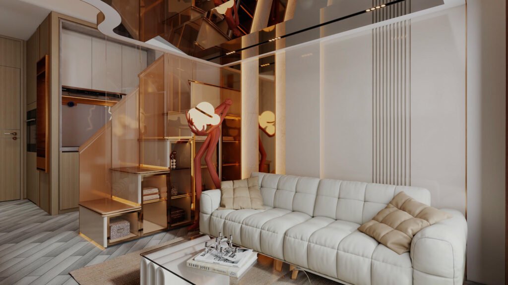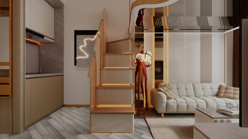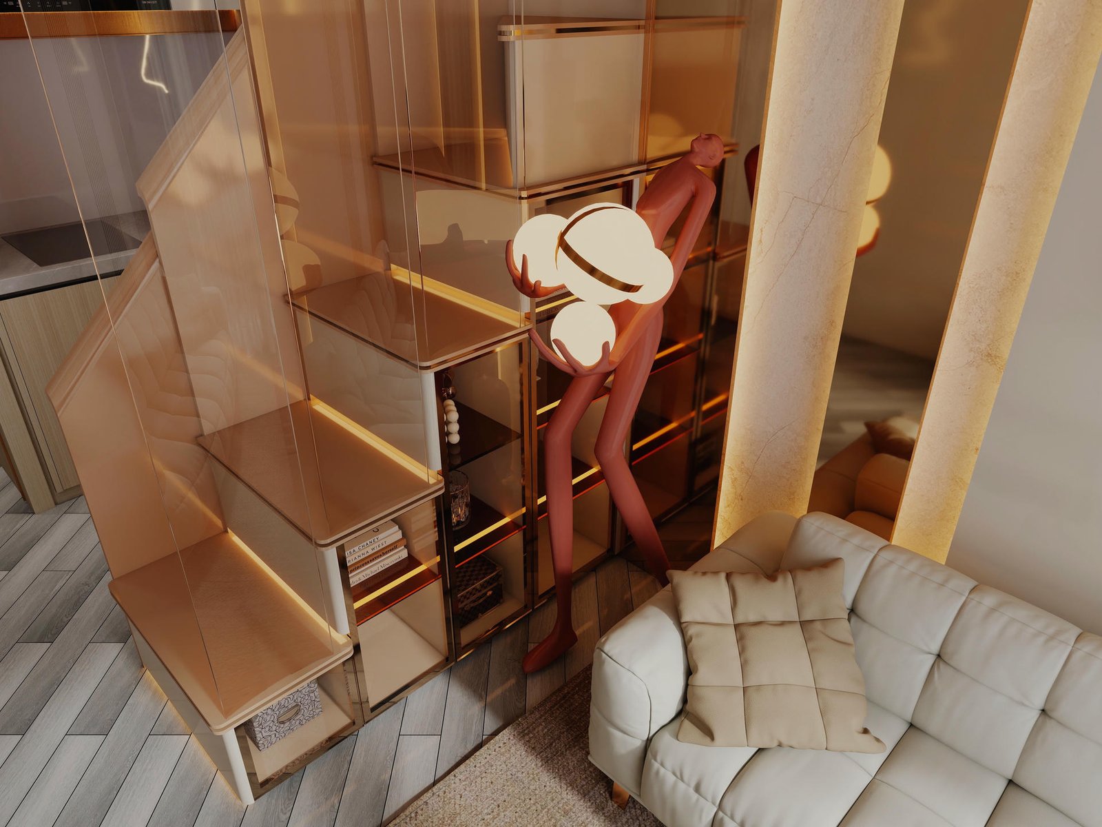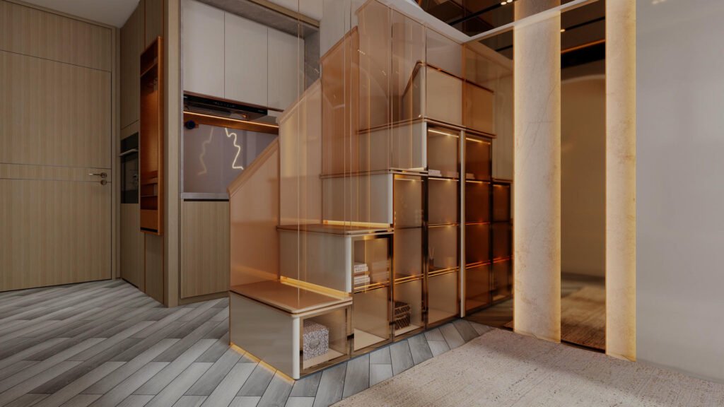 作為垂直動線的樓梯,本身就是一件藝術品。外側扶手選用跳色金屬,勾勒出輕奢的層次感;內側則以強化玻璃圍繞,既保障了安全,亦無礙光線與視線的流動。樓梯下的畸零空間亦被完全善用,化為兼具展示與收納功能的訂造傢俬,將實用性與美學無縫結合。