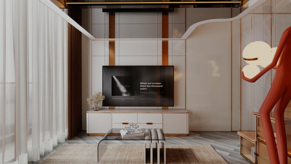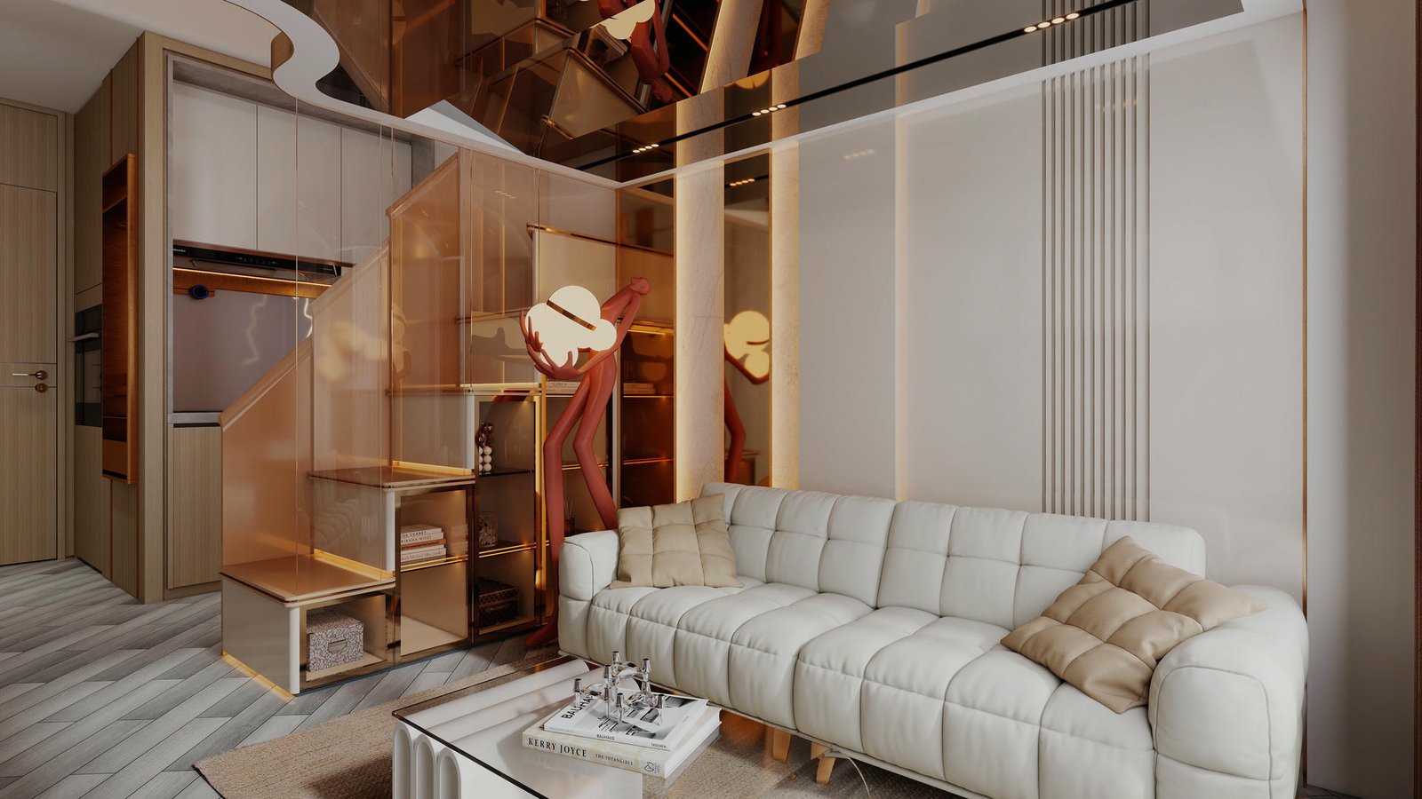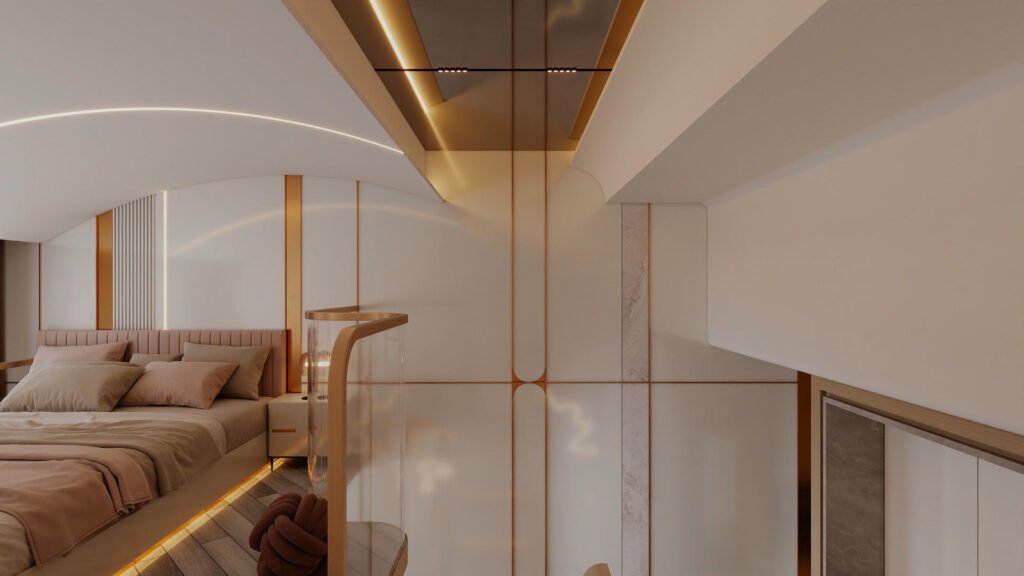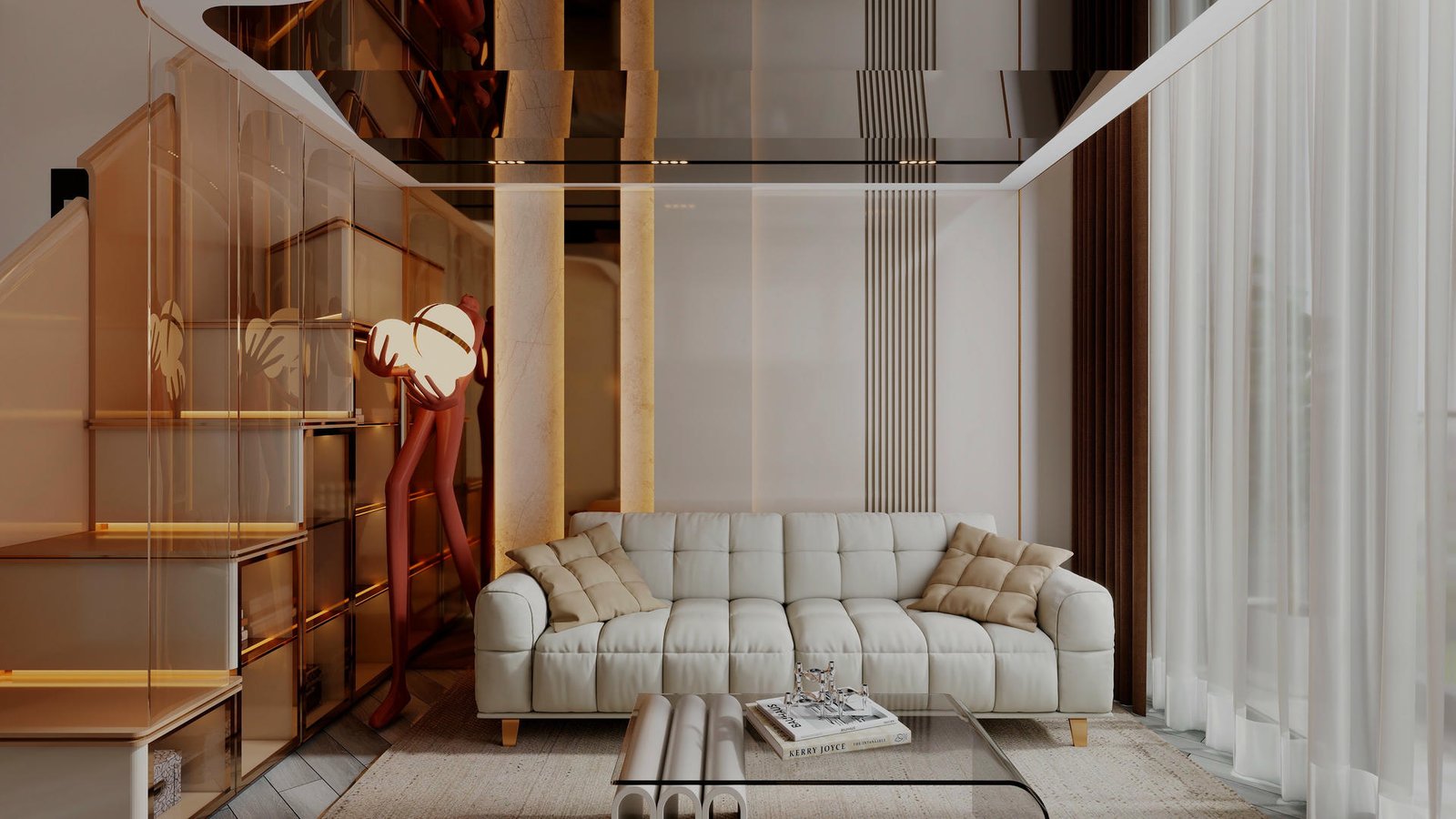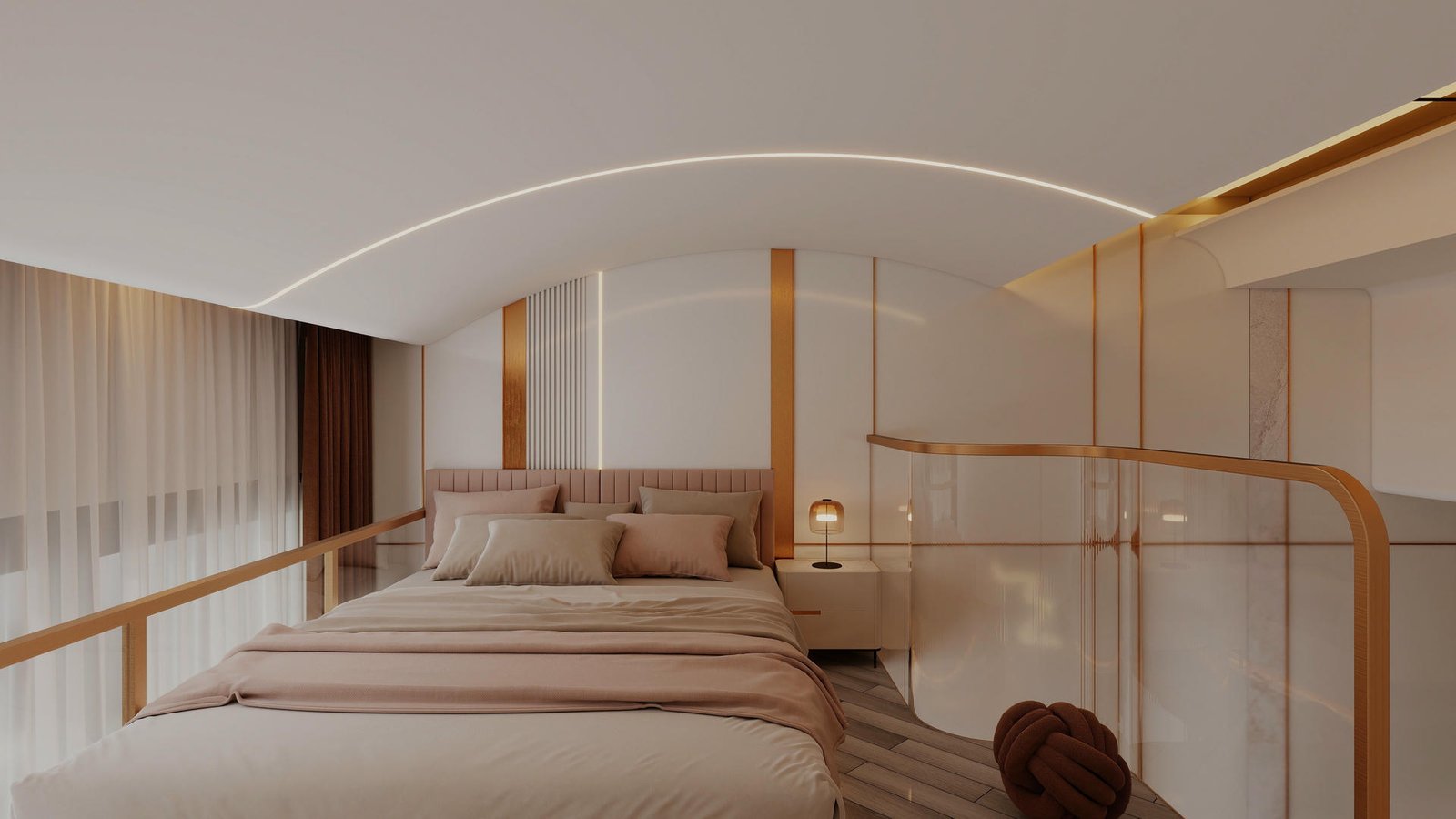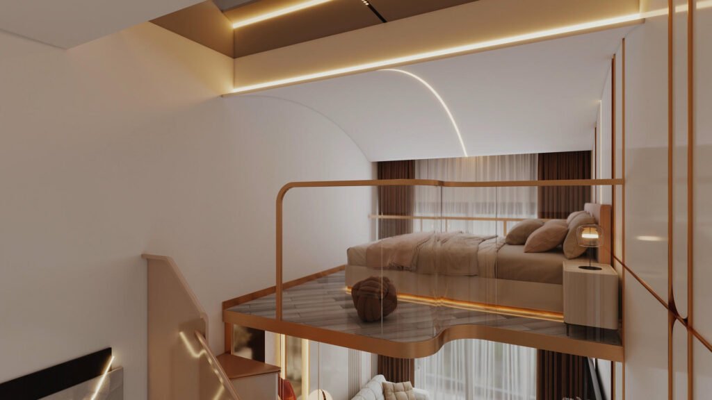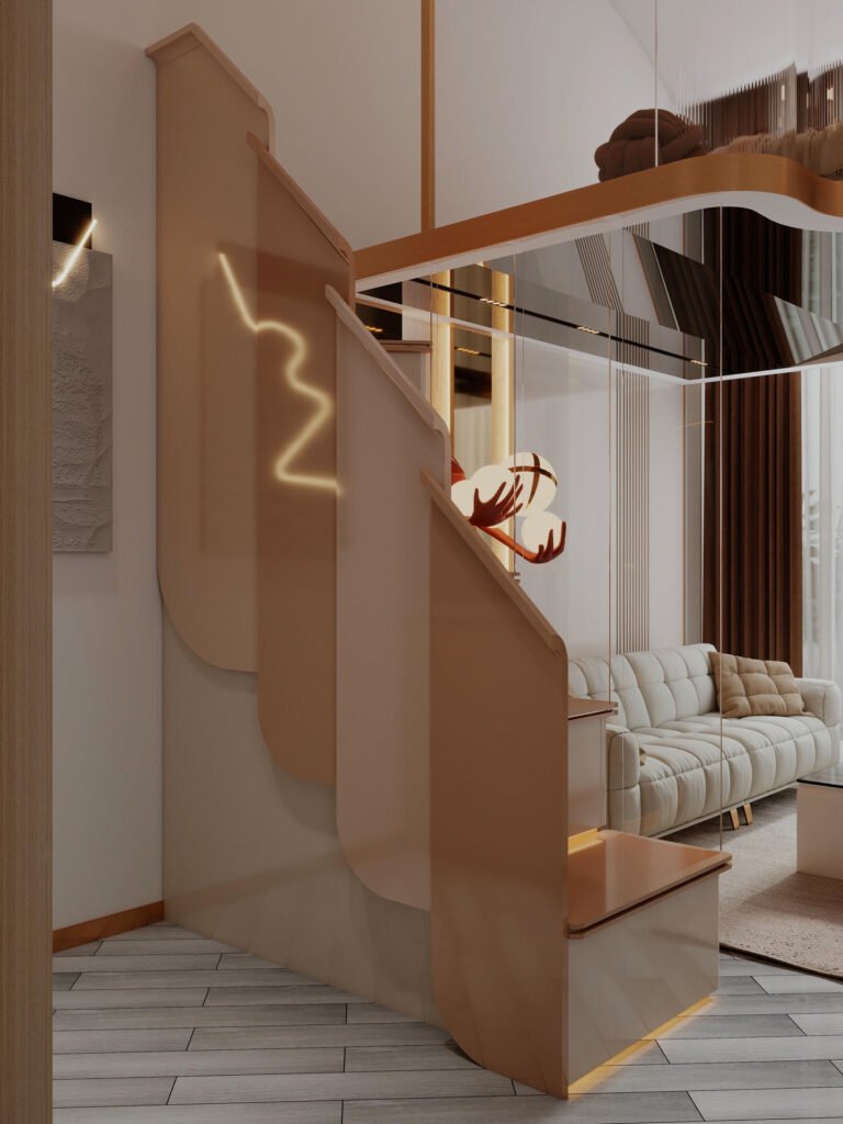 步入上層閣樓,一道優美的波浪型圓弧玻璃圍欄旋即映入眼簾,其流麗的線條與下方的空間遙相呼應。這道圍欄不僅是安全的屏障,更是引導自然光的媒介,讓窗外光線得以灑落至開放式廚房。上方的流線型假天花內藏著柔和的氣氛燈帶,為這個休憩區域增添了濃厚的現代感與未來格調。