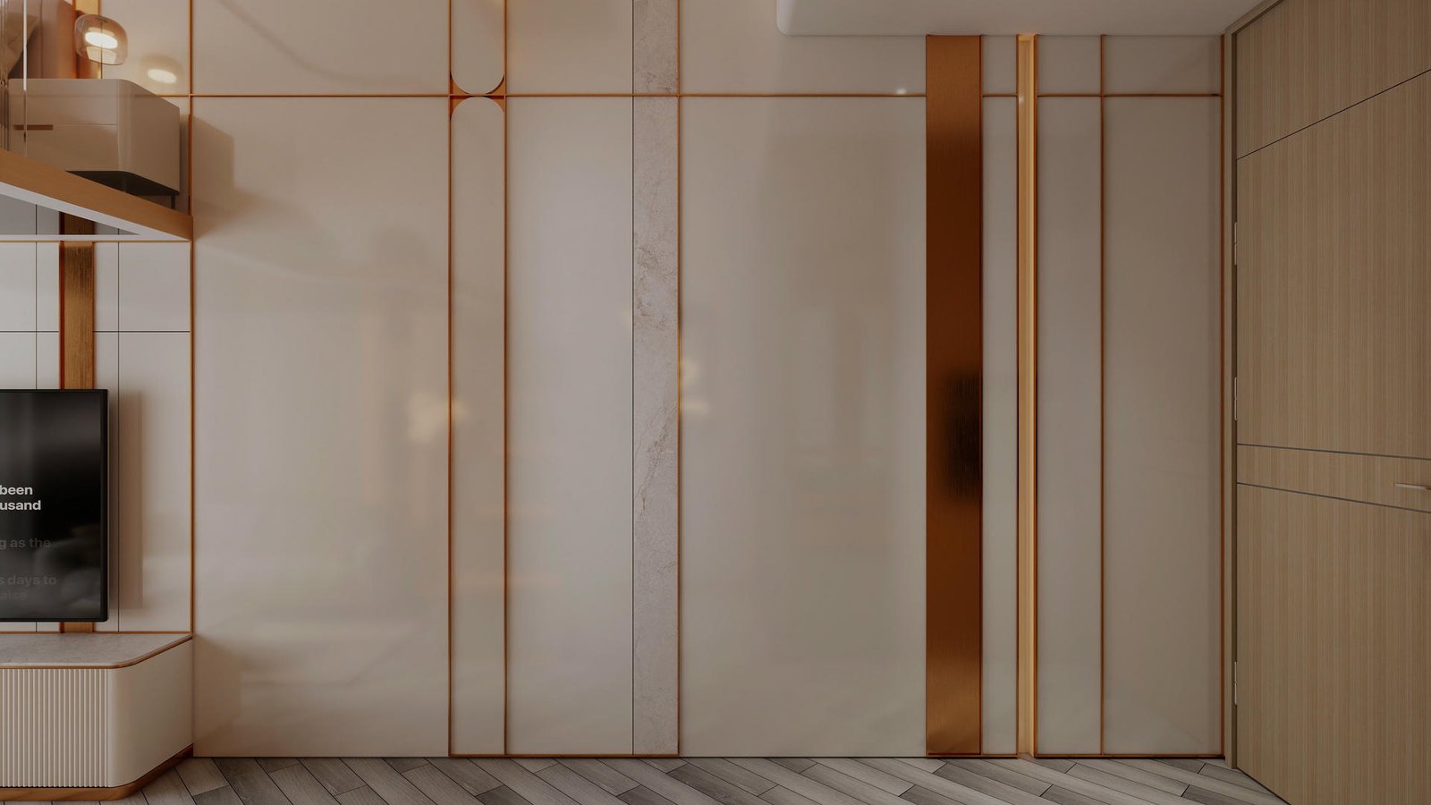 整個海茵莊園室內設計的靈魂,在於下層空間對「通透感」的極致追求。設計師大量運用鏡面元素及清玻璃,巧妙地反射並延伸室內景深,讓視覺穿透無阻,營造出遠超實際面積的空間感。一面由電視牆身延伸至玄關的特色牆,更是神來之筆;它將房門化為一道暗門設計,完美融入牆體,不僅統一了空間的風格,更顯俐落大氣。