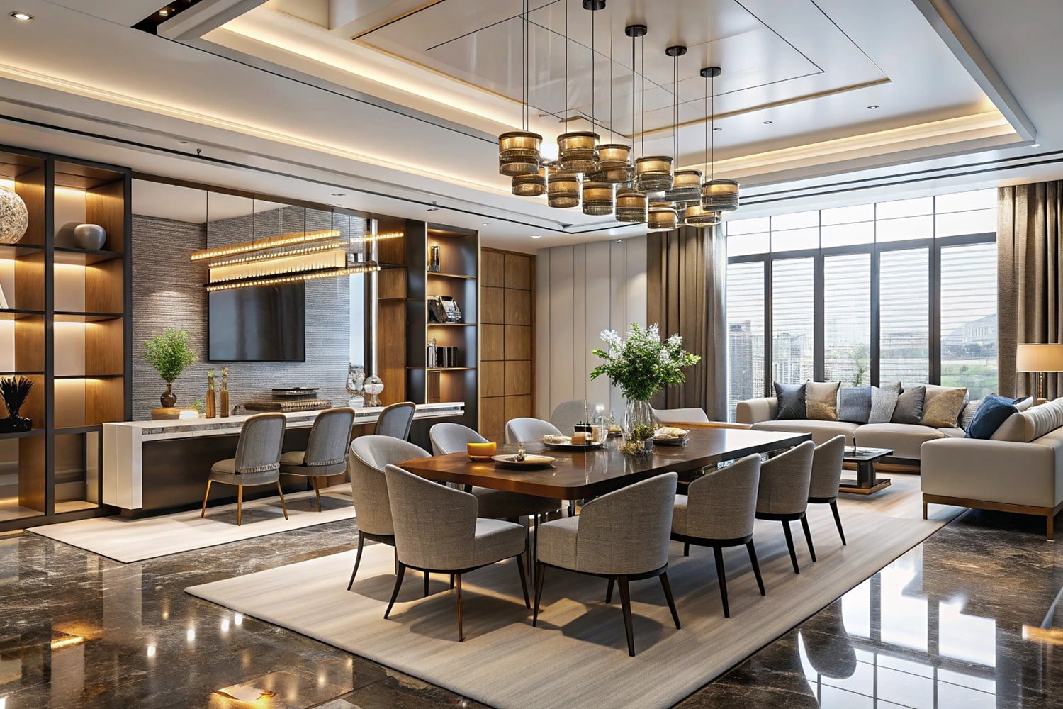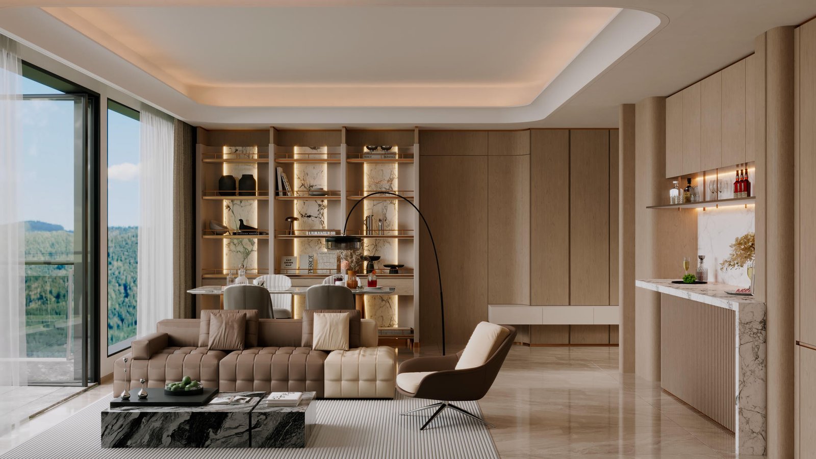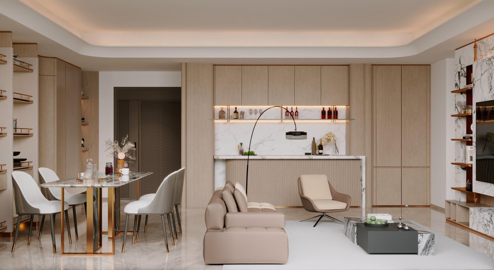 客廳作為家庭的核心,以溫潤的原木質感為基調,營造出溫馨宜人的氛圍。為了提升空間的格調,設計師巧妙地融入了略帶冷冽質感的岩石板材進行中和,讓溫暖的家居氣息中,透現出一份優雅與氣派。天花設計更是匠心獨運,一個巨大的圓角假天花設計,不僅柔化了空間線條,更將視覺的層次感與開闊感,提升至一個全新的境界。