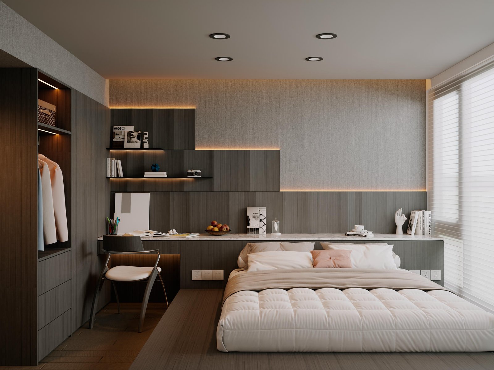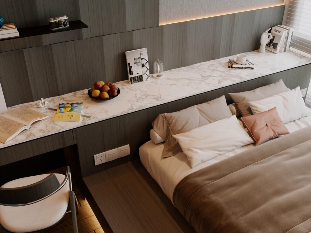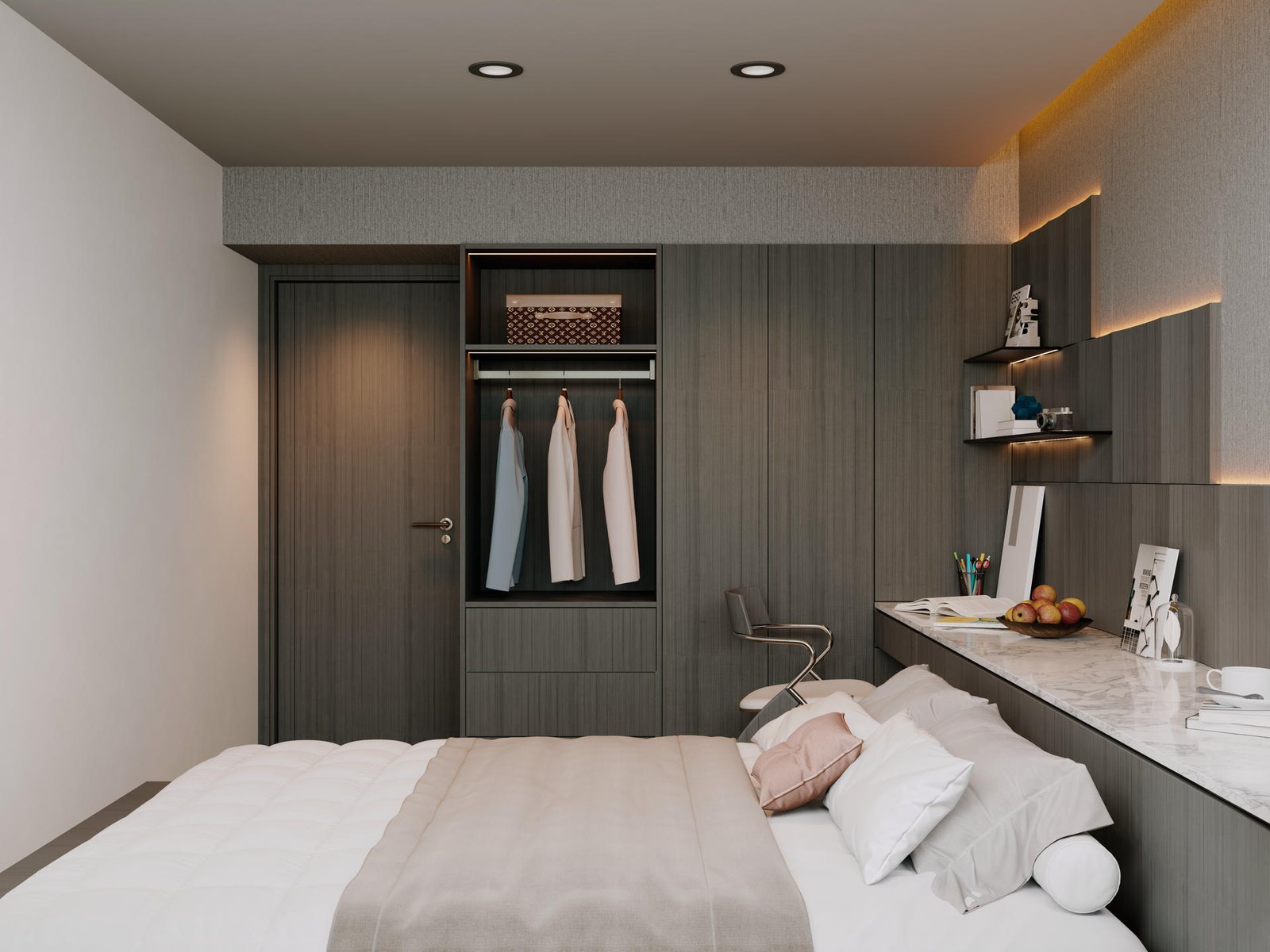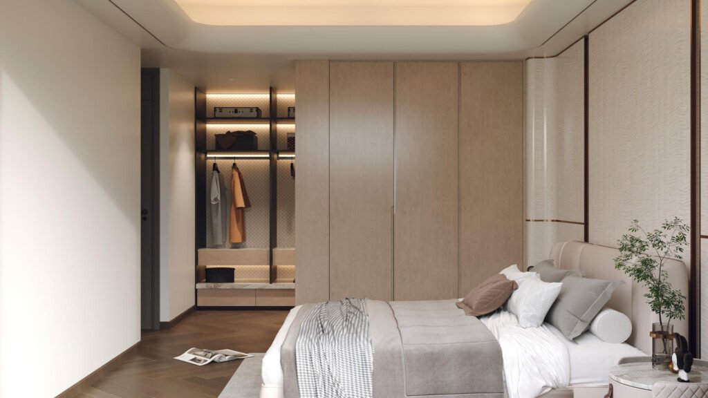 主人房是戶主的專屬領地,設計風格與客廳一脈相承。我們利用一組訂造傢俬衣櫃,巧妙地將偌大的空間分隔為寧靜的休息區與功能齊備的衣帽間。床頭特色牆以利落簡潔的線條為主,營造出靜謐舒適的睡眠環境;另一側的更衣區則採用了大量的開放式層架及燈帶設計,讓戶主心愛的手袋、首飾與收藏品如藝術品般陳列,一覽無遺。