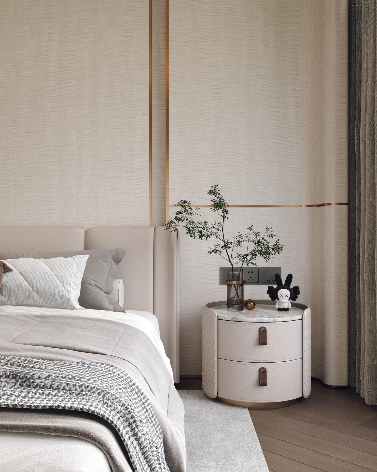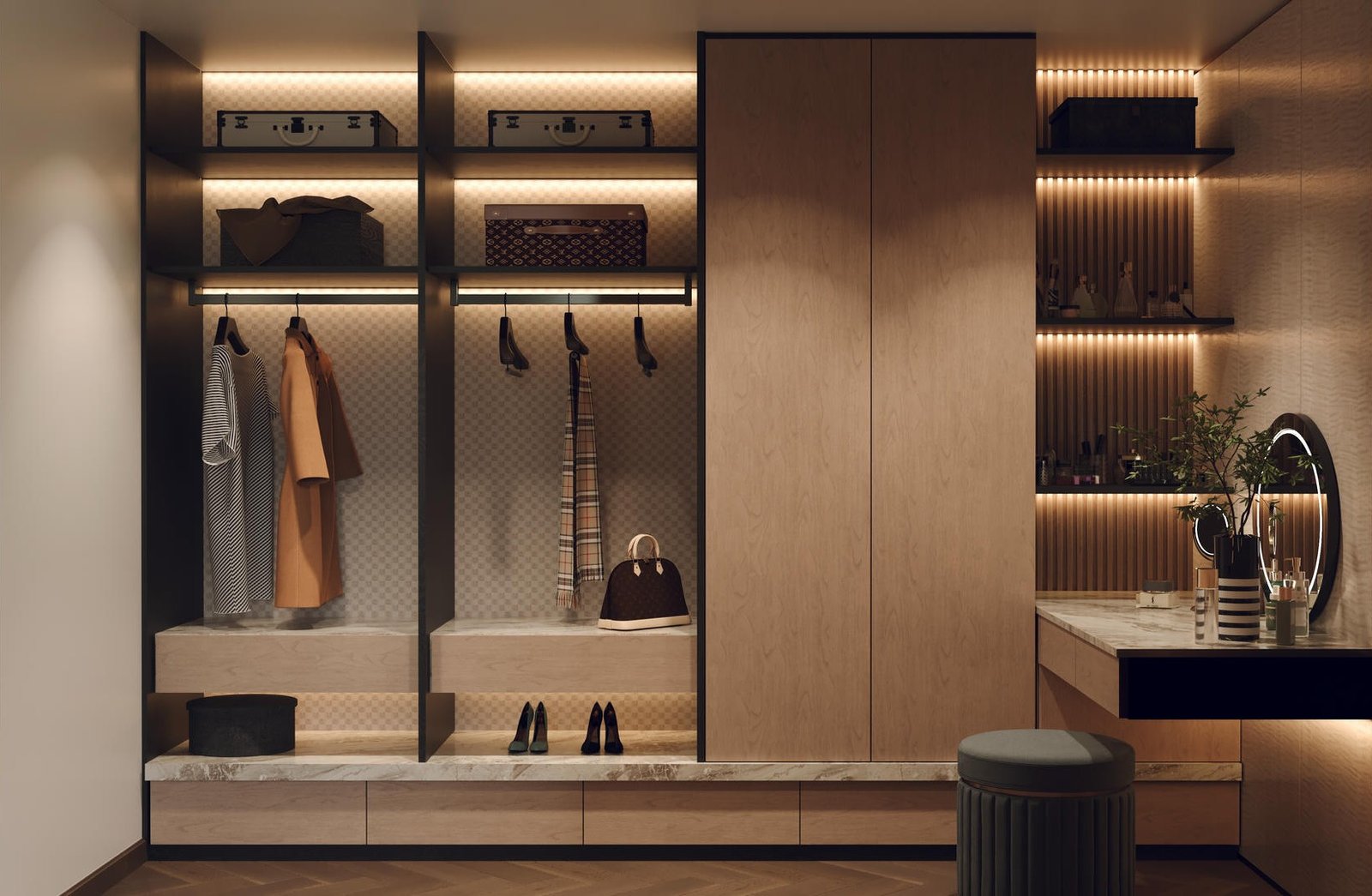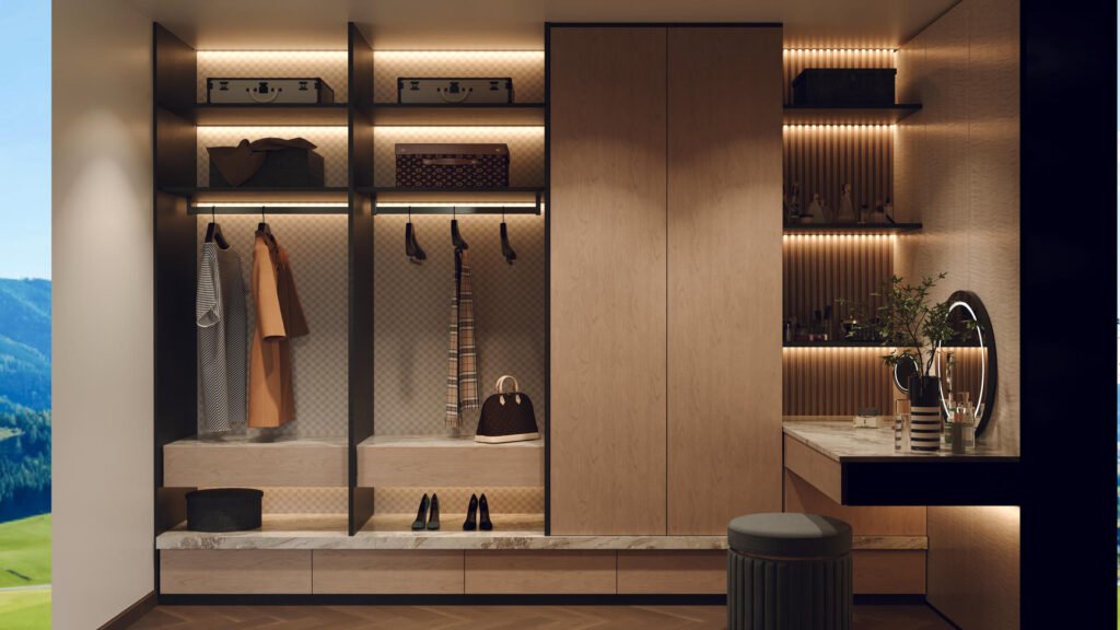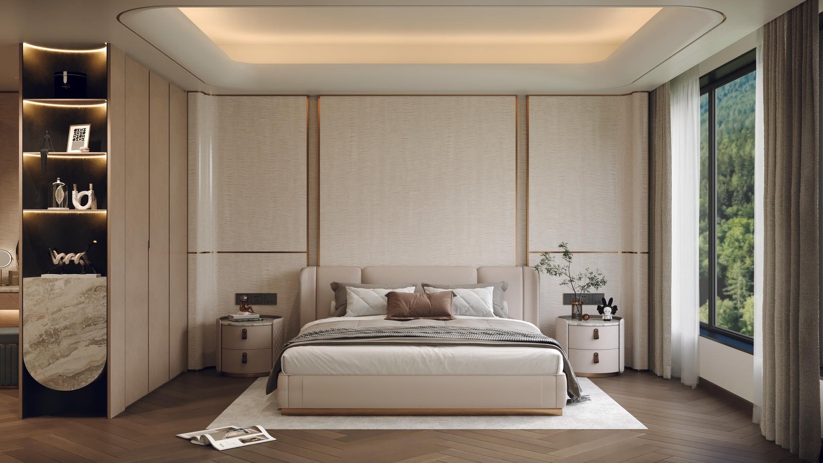 主人房是戶主的專屬領地,設計風格與客廳一脈相承。我們利用一組訂造傢俬衣櫃,巧妙地將偌大的空間分隔為寧靜的休息區與功能齊備的衣帽間。床頭特色牆以利落簡潔的線條為主,營造出靜謐舒適的睡眠環境;另一側的更衣區則採用了大量的開放式層架及燈帶設計,讓戶主心愛的手袋、首飾與收藏品如藝術品般陳列,一覽無遺。