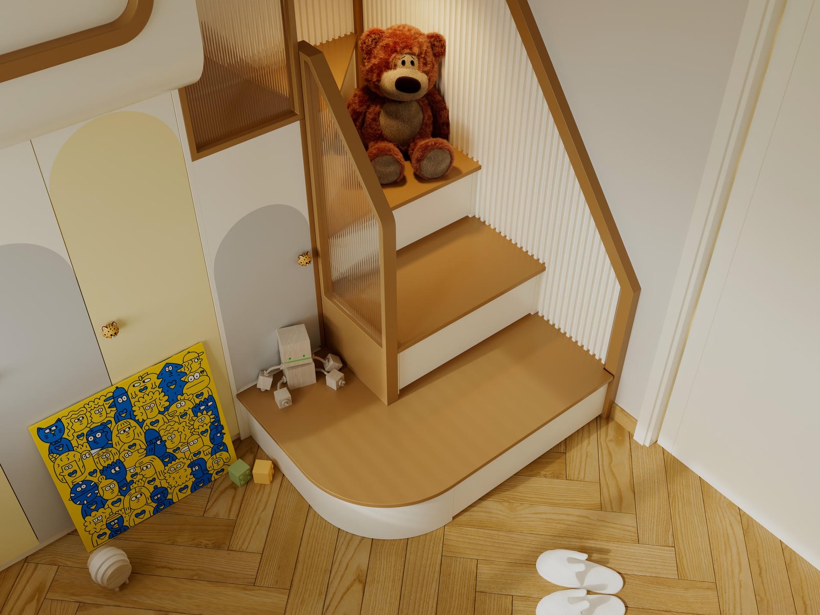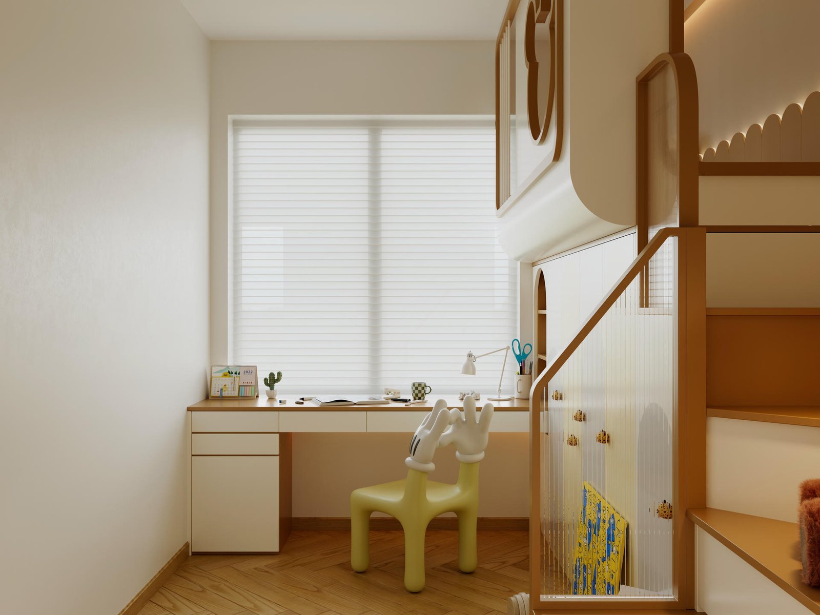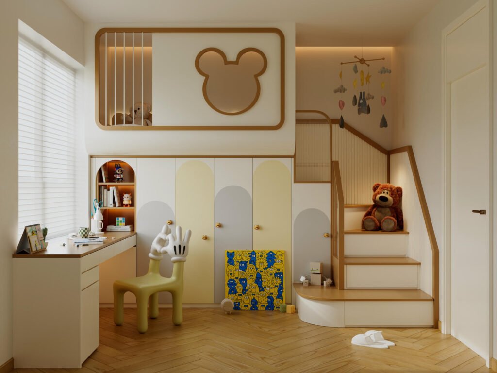 另外三間睡房的設計,則是對「個性化」的最佳詮釋。我們因應三位孩子的不同年齡與喜好,進行了截然不同的主題設定:一間以深色調呈現沉穩的現代魅力;一間採用色彩繽紛的上床下櫃設計,打造充滿玩味的秘密基地;最後一間則回歸極簡的原木風格,營造出無比溫暖的感覺。